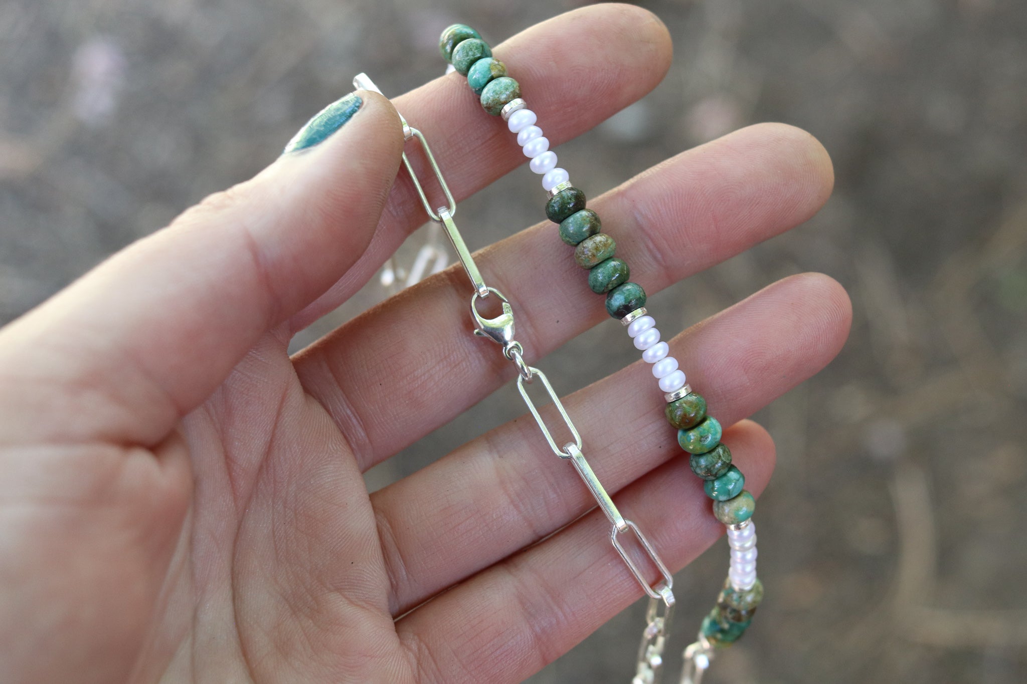 • 6 inches of hand strung beads + 10 inches of Sterling Silver Paperclip Chain (Can be clasped at any shorter length)