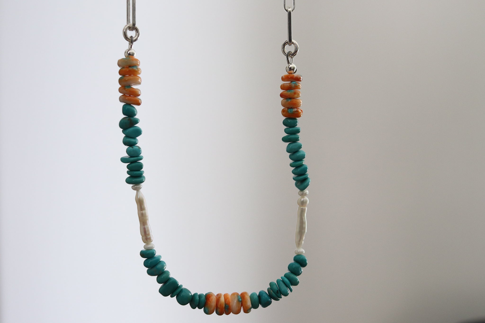 Spiny Oyster x Fox Turquoise x Pearls Beaded Necklace (18 inches) 2