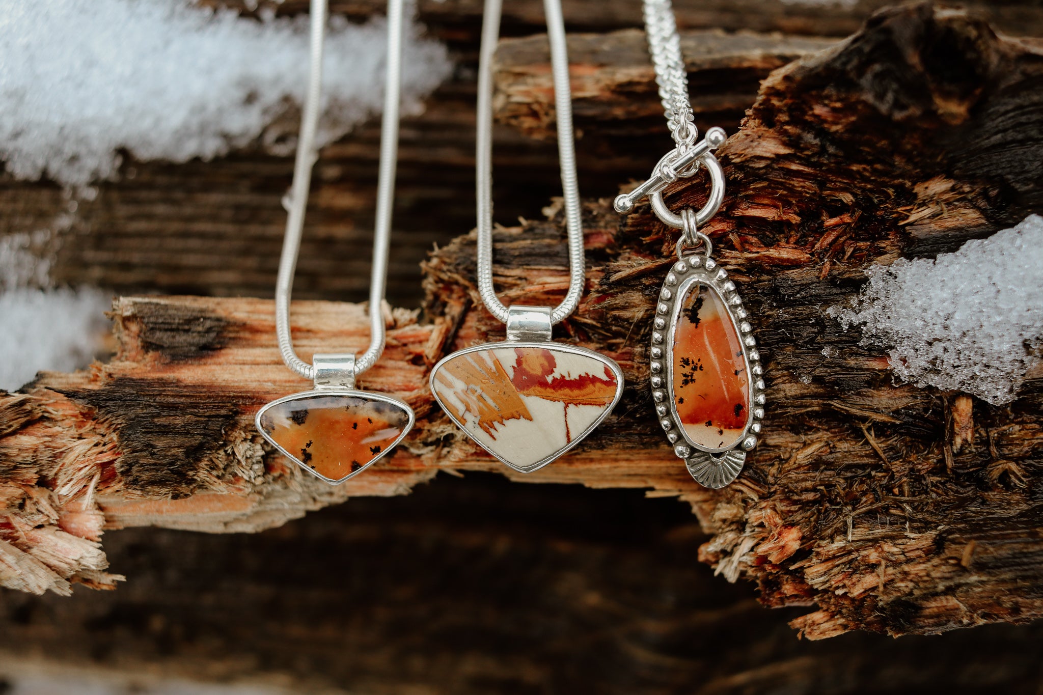 This piece of Original Owyhee Jasper from Oregon was cut in our lapidary studio and set in a handmade Sterling Silver setting and paired with your choice of chain. This necklace is a timeless piece of Oregon history!
