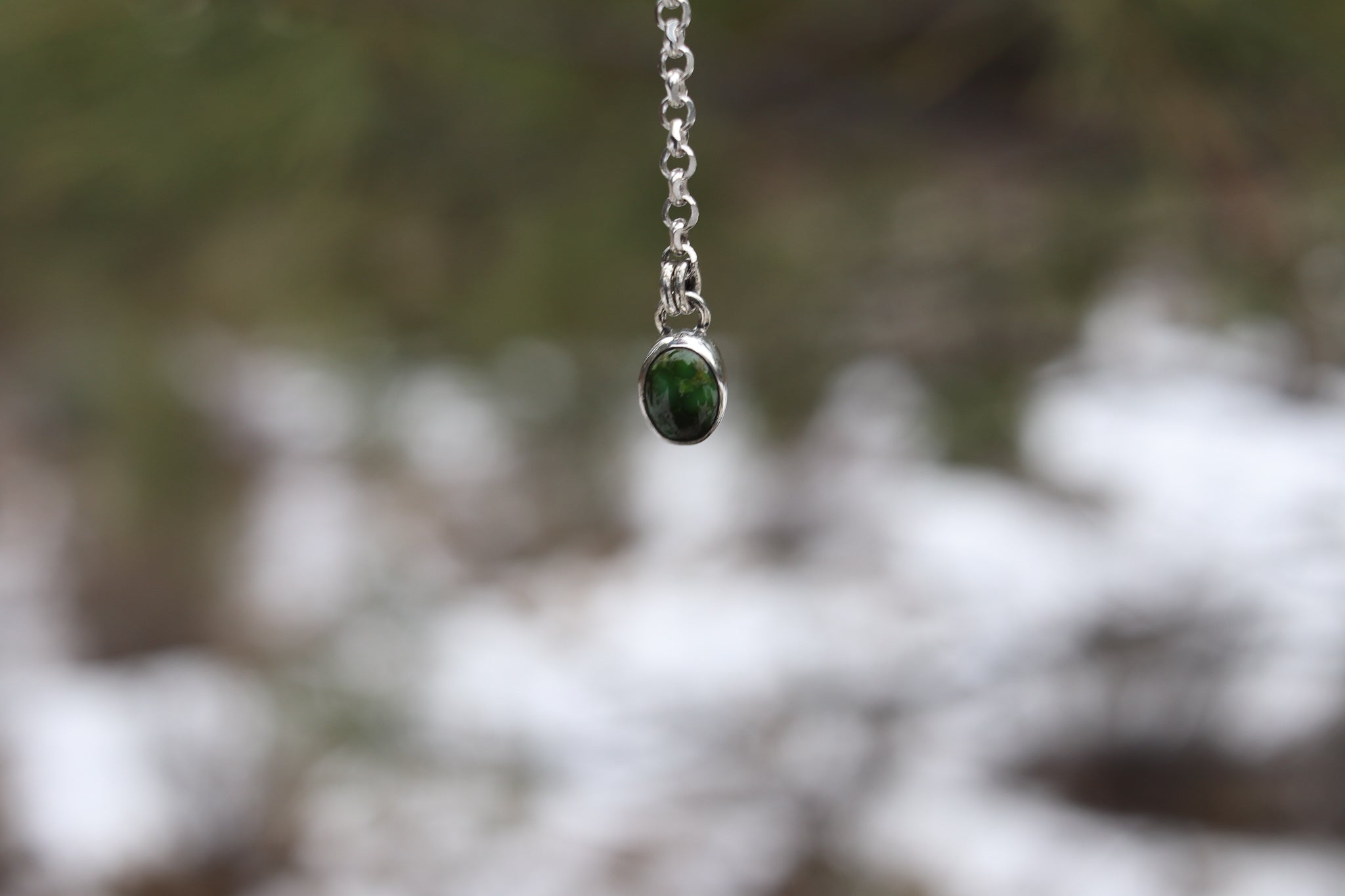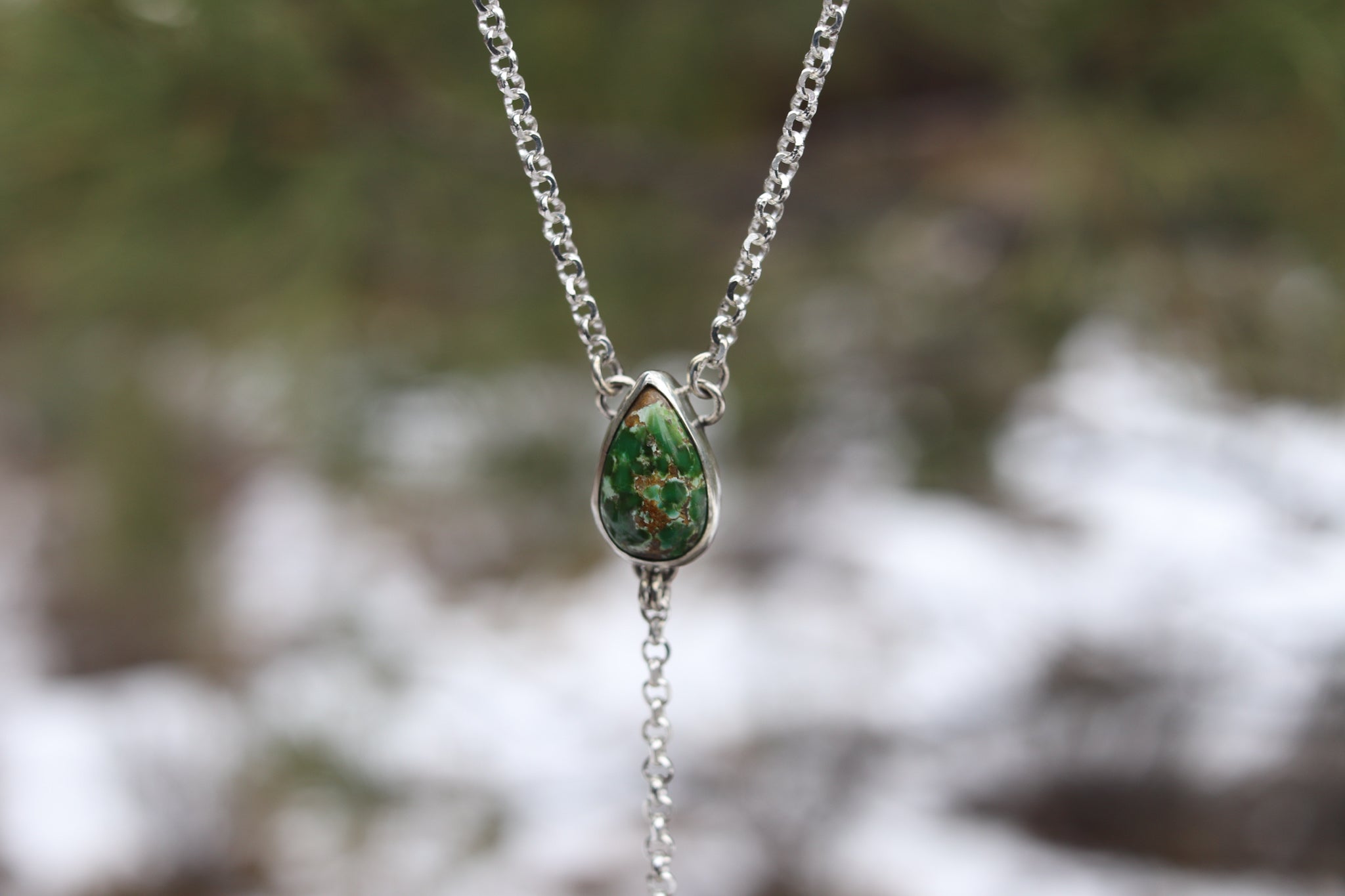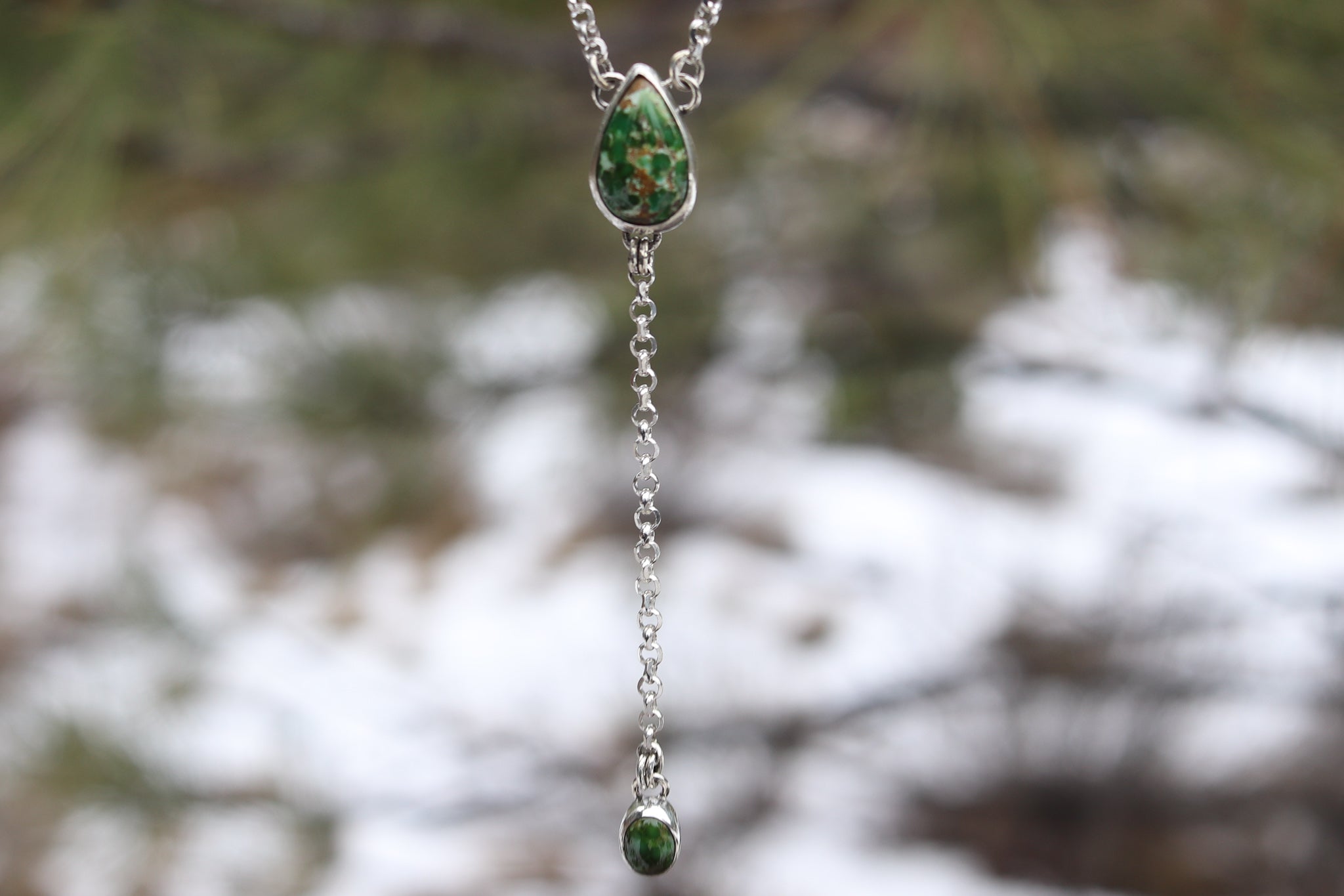 A tried and true staple necklace design-the lariat. It's a fan favorite for a reason! Deep green Sonoran Gold Turquoise set in handmade Sterling Silver settings and paired with Sterling rolo chain.